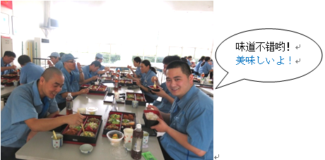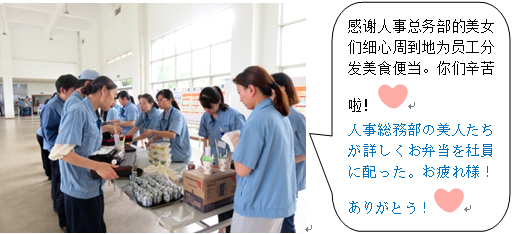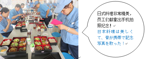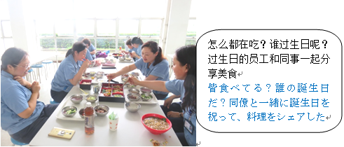 7月生まれの社員が食堂で、珍しそうに写真を撮って、同じ7月生まれの社員と楽しそうに食事をしています。中国の人はあまりお弁当を食べないけれど、美味しかったかな?今晩の夕食は、家族とこの写真を見ながら何を話すのかな?誕生日月のお弁当のことを、家庭での話題にしてもらえたら嬉しいです。